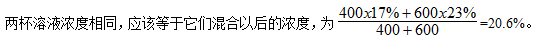 例題3:甲杯中有濃度為17%的溶液400克,乙杯中有濃度為23%的同種溶液600克,現(xiàn)在從甲、乙取出相同質(zhì)量的溶液,把甲杯取出的倒入乙杯中,把乙杯取出的倒入甲杯中,使甲、乙兩杯溶液的濃度相同,問現(xiàn)在兩杯溶液濃度是多少?( )