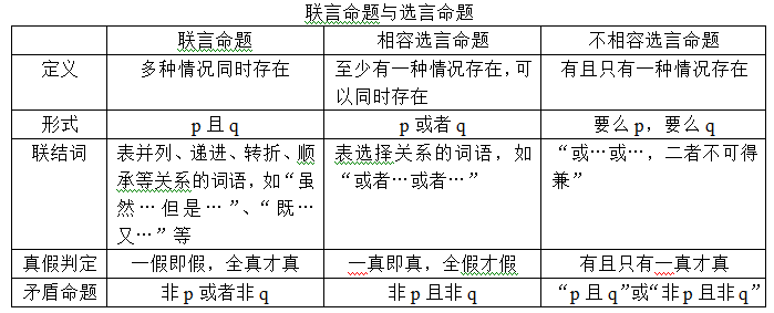 復(fù)言命題是由兩個或多個單句通過聯(lián)結(jié)詞聯(lián)結(jié)而成的命題。根據(jù)邏輯聯(lián)結(jié)詞的不同,國考中常見的復(fù)言命題主要有聯(lián)言命題、選言命題和假言命題三種,其中選言命題根據(jù)是否能夠同時存在又可分為相容選言命題和不相容選言命題兩種,假言命題根據(jù)條件和結(jié)論的關(guān)系也可分為充分條件假言命題、必要條件假言命題和充分必要條件假言命題三種。