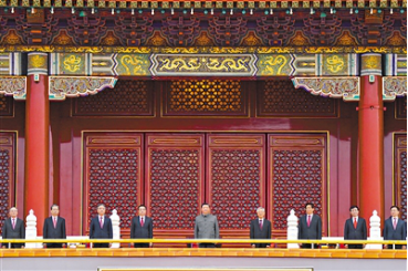 上午7時(shí)53分,在歡快的樂(lè)曲聲中,習(xí)近平等黨和國(guó)家領(lǐng)導(dǎo)人來(lái)到天安門(mén)城樓主席臺(tái),全場(chǎng)爆發(fā)出熱烈掌聲。