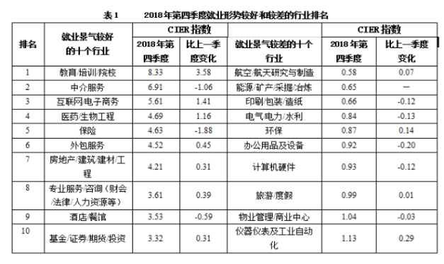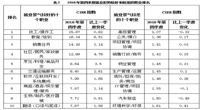 CIER指數(shù)用來反映就業(yè)市場景氣程度,其計算方法是:CIER指數(shù)=市場招聘需求人數(shù)/市場求職申請人數(shù)。根據(jù)有關(guān)機構(gòu)發(fā)布的數(shù)據(jù),2018年第一季度CIER指數(shù)為1.91,第二季度為1.88,第三季度為1.97,第四季度為2.38。2018年第三季度,招聘需求人數(shù)環(huán)比下降20.79%,求職申請人數(shù)環(huán)比下降24.37%;第四季度,招聘需求人數(shù)環(huán)比增加25.42%,求職申請人數(shù)環(huán)比增加3.9%。