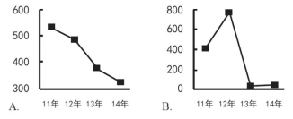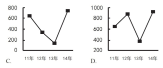119.以下哪項(xiàng)的折線圖可以準(zhǔn)確表現(xiàn)2011~2014年間,我國會展業(yè)總產(chǎn)值同比增量的變化情況(單位:億元)?( )