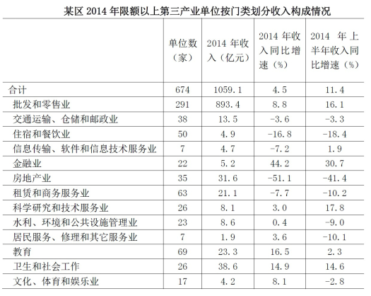 2014年某區(qū)限額以上第三產(chǎn)業(yè)單位共674家,實(shí)際收入1059.1億元,同比增長4.5%;實(shí)現(xiàn)利潤總額13.5億元,同比增長11.9%;從業(yè)人員達(dá)到58631人,同比下降4.3%。