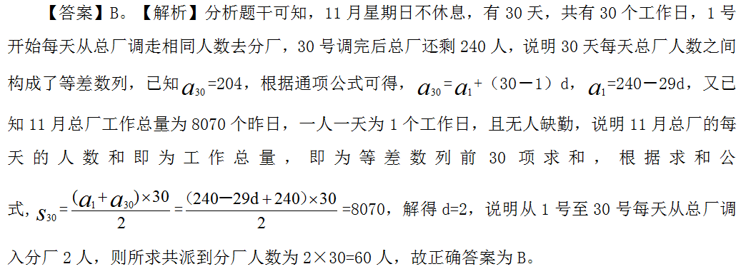 【例2】某工廠11月份工作忙,星期日不休息,而且從第一天開始,每天都從總廠陸續(xù)派相同的工人到分廠工作,直到月底,總廠還剩工人240人。如果月底統(tǒng)計總工廠工人的工作量是8070個工作日(一人工作一天為1個工作日),且無人缺勤,那么,這月由總廠派到分廠工作的工人共有多少人?( )