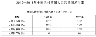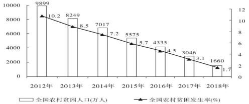 黨的十八大以來,脫貧工作取得巨大成效,全國農村貧困人口大幅減少。截至2018年末,全國農村貧困人口從2012年末的9899萬人減少至1660萬人;農村貧困發(fā)生率從2012年的10.2%下降至1.7%,累計下降8.5個百分點。