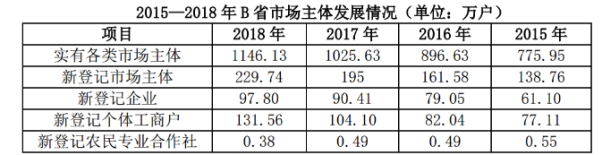 近年來,B省營商環(huán)境不斷優(yōu)化,市場活力不斷增強,新登記市場主體保持較快增長勢頭。2018年,全省新登記市場主體229.74萬戶,日均新登記市場主體6294萬戶,同比增長17.82%。