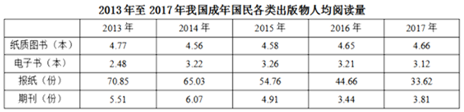 C.2017年我國成年國民人均每天閱讀紙質(zhì)圖書時長低于閱讀報紙與閱讀期刊時長之和