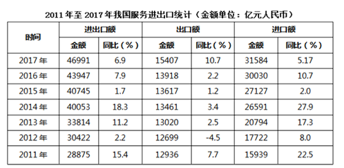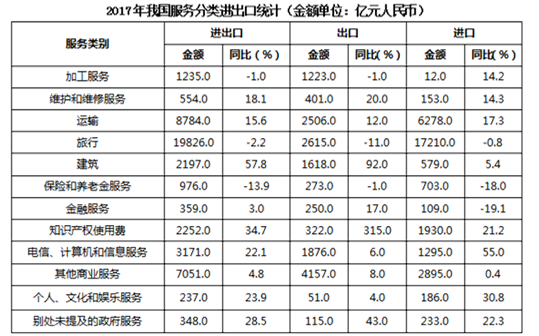 D.2017年我國服務(wù)進出口中,別處未提及的政府服務(wù)進出口占比最小