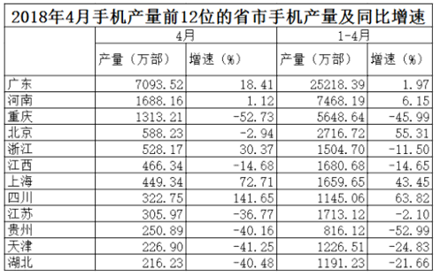 ③2018年4月和2018年1-4月手機產(chǎn)量增速最高的省市不是同一個
