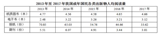 2017年我國成年國民圖書閱讀率為59.1%,比上年增加0.3個(gè)百分點(diǎn);報(bào)紙閱讀率為37.6%,比上年降低2.1個(gè)百分點(diǎn);期刊閱讀率為25.3%,比上年增加1個(gè)百分點(diǎn)。