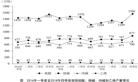 2018年我國硫酸、燒堿、純堿和乙烯產(chǎn)量分別為5496萬噸、3159萬噸、2651萬噸和129萬噸。2016年一季度至2018年四季度我國硫酸、燒堿、純堿和乙烯產(chǎn)量見下圖。