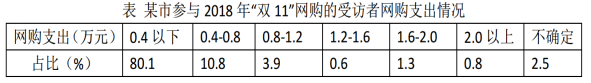 D.“雙11”網(wǎng)購支出0.8—1.2萬元的受訪者人數(shù)比網(wǎng)購支出1.6—2.0萬元的多2倍
