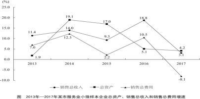 2017年某市調(diào)查總隊(duì)對(duì)全市服務(wù)業(yè)小微企業(yè)的抽樣調(diào)查顯示,2017年全市服務(wù)業(yè)小微樣本企業(yè)總資產(chǎn)938.6億元,銷售總收入105.4億元,銷售總費(fèi)用6.8億元;人員薪酬19.3億元,比上年增長9.3%;從業(yè)人員29028人,與上年持平;營業(yè)稅金及附加1.1億元,比上年下降29.5%;繳納增值稅2.3億元,比上年增長11.6%。