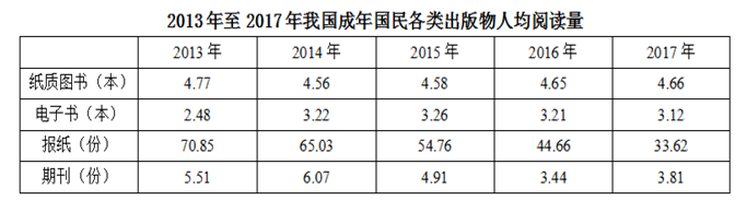 2017年我國(guó)成年國(guó)民圖書閱讀率為59.1%,比上年增加0.3個(gè)百分點(diǎn);報(bào)紙閱讀率為37.6%,比上年降低2.1個(gè)百分點(diǎn);期刊閱讀率為25.3%,比上年增加1個(gè)百分點(diǎn)。