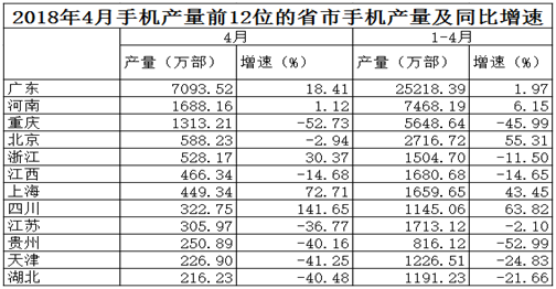 ?、?018年4月和2018年1-4月手機產(chǎn)量增速最高的省市不是同一個