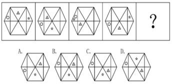 【答案】C。【解析】第一步,觀察特征。組成元素相同,元素位置發(fā)生變化,優(yōu)先考慮動態(tài)位置類平移。第二步,一條式,從左到右找規(guī)律。觀察輪廓內(nèi)三種元素的位置,發(fā)現(xiàn)三角形沿著矩形內(nèi)部的六個面每次逆時針平移一個位置,圓圈在左側(cè)的兩個區(qū)域內(nèi)循環(huán)移動,五角星在和外邊框相連的六個面上每次順時針移動2個位置,觀察選項,只有C項符合。故正確答案為C。
