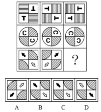 【答案】A?!窘馕觥?/span>元素組成不同,優(yōu)先考慮屬性規(guī)律。九宮格優(yōu)先看橫行,第一行圖形均由直線構(gòu)成,第二行圖形均由曲線構(gòu)成,第三行圖形均由直線和曲線構(gòu)成,因此問號處圖形應(yīng)由直線和曲線構(gòu)成,只有A項符合,當(dāng)選。故正確答案為A。