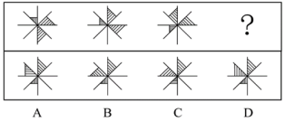 【答案】B?!窘馕觥?/span>第一步,觀察特征。組成元素相同,優(yōu)先考慮位置類規(guī)律。第二步,一條式,從左到右找規(guī)律。圖中一共是三個大小不一樣的陰影三角形,它們整體沿直線向逆時針方向翻轉(zhuǎn)。只有B項符合。故正確答案為B。