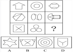 【答案】D?!窘馕觥?/span>第一步,觀察特征。組成元素不同,優(yōu)先考慮數(shù)量類或?qū)傩灶?。每個圖形均有封閉區(qū)間,考慮數(shù)面。第二步,九宮格,橫向規(guī)律較為常見,優(yōu)先考慮。題干中九宮格中,第一列全部為直線圖形,第二列全部為曲線圖形,第三列有曲有直。分析選項。A項:直線圖形,排除;B項:直線圖形,排除;C項:曲線圖形,排除;D項:有曲有直,符合。故正確答案為D。