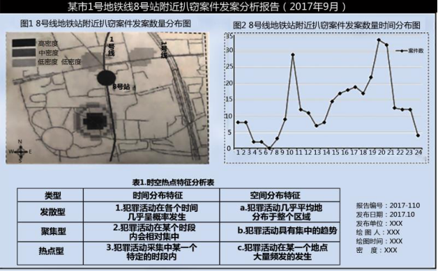 (八)某市公安機(jī)關(guān)針對(duì)該市2017年9月份扒竊案件的發(fā)案情況進(jìn)行了統(tǒng)計(jì)分析,下圖為地鐵1號(hào)線8號(hào)站附近扒竊案件的發(fā)案分析報(bào)告。其中,圖1是8號(hào)地鐵站附近扒竊案件發(fā)案數(shù)量分布圖(發(fā)案數(shù)量越多,顏色越深),圖2是8號(hào)地鐵站附近扒竊案件發(fā)案數(shù)時(shí)間分布圖;表1是時(shí)空熱點(diǎn)特征分析表。