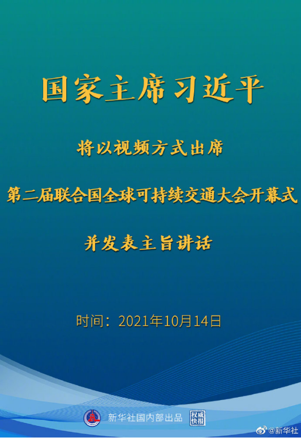 新華社北京10月13日電 外交部發(fā)言人華春瑩13日宣布:國(guó)家主席習(xí)近平將于10月14日以視頻方式出席第二屆聯(lián)合國(guó)全球可持續(xù)交通大會(huì)開(kāi)幕式并發(fā)表主旨講話。