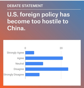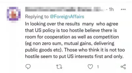 有人留言稱,“審視這些結(jié)果,就會(huì)發(fā)現(xiàn)許多同意美國(guó)政策過于敵對(duì)的人認(rèn)為,存在合作與競(jìng)爭(zhēng)的空間(如非零和、互惠互利、提供全球公共產(chǎn)品等)。那些認(rèn)為對(duì)中國(guó)不夠敵對(duì)的人,似乎只把美國(guó)的利益放在第一位,而且是唯一的?!?/span>