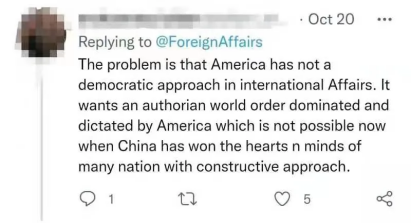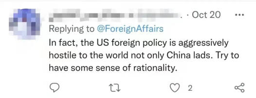 調(diào)查結(jié)果刊出后,海外網(wǎng)友也紛紛在《外交》雜志推特留言表達(dá)自己的觀點(diǎn)。