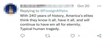 “僅有240年歷史的美國(guó)精英們認(rèn)為他們知道一切、擁有一切,并將永遠(yuǎn)擁有一切。典型的人間悲劇?!?/span>