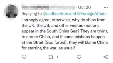 還有人認(rèn)為,美國(guó)所謂“中國(guó)威脅論”不過是自導(dǎo)自演罷了。“否則,為什么英國(guó)、美國(guó)等西方國(guó)家的船只出現(xiàn)在南海?它們正試圖把中國(guó)逼入絕境,如果臺(tái)灣海峽發(fā)生什么意外,它們又會(huì)像往常一樣指責(zé)中國(guó)發(fā)動(dòng)戰(zhàn)爭(zhēng)!”