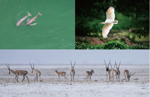 我國系統(tǒng)實(shí)施瀕危物種拯救工程,多種瀕危野生動(dòng)植物得到有效保護(hù)和恢復(fù)。這是一張拼版照片:左上圖為2021年5月11日,在湖北省宜昌市江邊,長江江豚在水中嬉戲(無人機(jī)照片,新華社記者 肖藝九/攝);右上圖為2021年5月13日拍攝的陜西省漢中市洋縣朱鹮生態(tài)園內(nèi)的朱鹮(新華社記者 劉瀟/攝);下圖為2021年4月20日,藏羚羊在三江源可可西里地區(qū)活動(dòng)(新華社記者 吳剛/攝)。