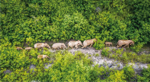 原本棲息在云南省西雙版納傣族自治州境內(nèi)的一群野生亞洲象北上及返回之旅,引發(fā)全球關(guān)注。中國政府與民眾攜手護(hù)象的行動(dòng)得到世界點(diǎn)贊。圖為2021年8月9日在云南省玉溪市元江縣境內(nèi)拍攝的象群(無人機(jī)照片)。 新華社記者 胡超/攝