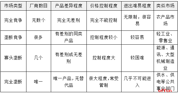 基礎(chǔ)理論:根據(jù)市場(chǎng)上競(jìng)爭(zhēng)和壟斷的關(guān)系,市場(chǎng)類(lèi)型可以分為:完全競(jìng)爭(zhēng)市場(chǎng)、壟斷競(jìng)爭(zhēng)市場(chǎng)、寡頭壟斷市場(chǎng)及完全壟斷市場(chǎng)??梢詮漠a(chǎn)商數(shù)目、產(chǎn)品差異程度、價(jià)格控制程度、進(jìn)出市場(chǎng)的難易程度上區(qū)別,如下表所示: