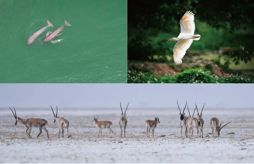 我國系統(tǒng)實施瀕危物種拯救工程,多種瀕危野生動植物得到有效保護和恢復(fù)。這是一張拼版照片:左上圖為2021年5月11日,在湖北省宜昌市江邊,長江江豚在水中嬉戲(無人機照片,新華社記者 肖藝九/攝);右上圖為2021年5月13日拍攝的陜西省漢中市洋縣朱鹮生態(tài)園內(nèi)的朱鹮(新華社記者 劉瀟/攝);下圖為2021年4月20日,藏羚羊在三江源可可西里地區(qū)活動(新華社記者 吳剛/攝)。