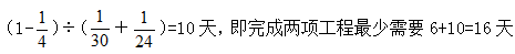 有甲、乙兩項(xiàng)工程,張師傅單獨(dú)完成甲工程需6天,單獨(dú)完成乙工程需30天,李師傅單獨(dú)完成甲工程需18天,單獨(dú)完成乙工程需24天,若合作兩項(xiàng)工程,最少需要的天數(shù)為:( )