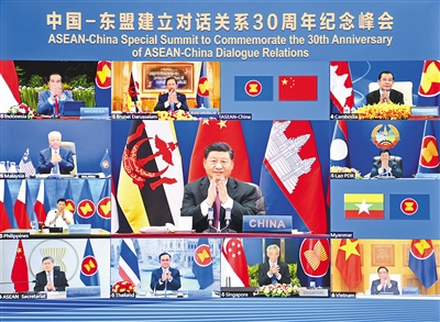 11月22日上午,國(guó)家主席習(xí)近平在北京以視頻方式出席并主持中國(guó)—東盟建立對(duì)話(huà)關(guān)系30周年紀(jì)念峰會(huì),發(fā)表題為《命運(yùn)與共共建家園》的重要講話(huà)。中國(guó)東盟正式宣布建立中國(guó)東盟全面戰(zhàn)略伙伴關(guān)系。 |