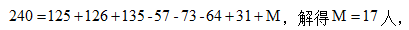 某單位共有240名員工,其中訂閱A期刊的有125人,訂閱B期刊的有126人,訂閱C期刊的有135人,訂閱A、B期刊的有57人,訂閱A、C期刊的有73人,訂閱B、C期刊的有64人,訂閱3種期刊的有31人。問:沒有訂閱這三種期刊中任何一種的有多少人?( )