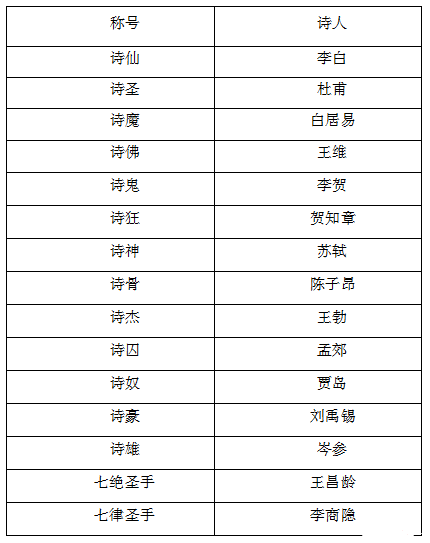 根據(jù)唐詩中詩人寫作內(nèi)容的不同風格,后人賦以不同的稱號,為了方便大家識記,咱們以表格的形式進行梳理: