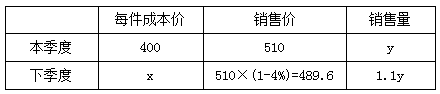 【答案】B【解析】設(shè)下季度每件成本價為x元,本季度銷售y件,梳理題干可列表如下: