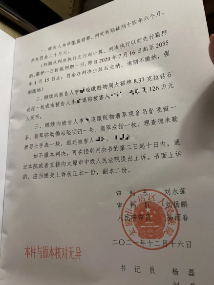 郝女士提供了鉆戒和手表的發(fā)票及銷(xiāo)售單,未提供其他飾品的票據(jù)。她稱(chēng),因搬家丟失,她無(wú)法提供翡翠的票據(jù),三件翡翠均價(jià)值百萬(wàn)以上,這些丟失的物品是分別于2010年、2011年、2014年在廣州、澳門(mén)、香港等地購(gòu)買(mǎi)。事發(fā)后她當(dāng)即報(bào)警,當(dāng)晚,她的丈夫被平遙縣公安局帶到警局錄口供,次日,她丈夫被取保候?qū)?。一直?021年5月21日,平遙縣公安局出具《撤銷(xiāo)案件決定書(shū)》,認(rèn)為相關(guān)賭博案無(wú)犯罪事實(shí),決定撤銷(xiāo)此案。