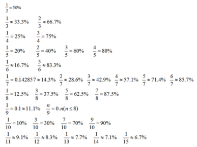 在資料分析的材料中我們可以看到很多百分?jǐn)?shù),在解答與材料相關(guān)的題目時(shí),基本上都會(huì)用到百分?jǐn)?shù)。原則上來說,很多百分?jǐn)?shù)都可以轉(zhuǎn)化為特征的分?jǐn)?shù),如果在實(shí)際考試中能夠把一些百分?jǐn)?shù)轉(zhuǎn)化為與之接近的特征分?jǐn)?shù),那將大大的簡(jiǎn)化運(yùn)算,減少計(jì)算量。今天我們就一起來看看一些常見的分?jǐn)?shù)如何進(jìn)行轉(zhuǎn)化。