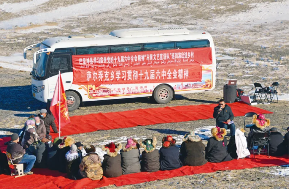 新疆巴里坤哈薩克自治縣組建“馬背文藝宣講隊”,深入邊遠農(nóng)牧區(qū)鄉(xiāng)村開展黨的十九屆六中全會精神巡回宣講。圖為2021年12月1日,宣講隊給冬牧場的哈薩克族牧民宣講全會精神。人民圖片張建剛/攝