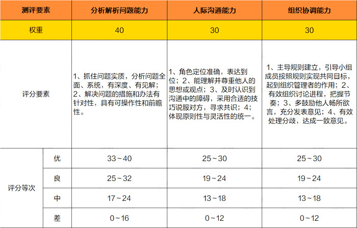 但近幾年常以無(wú)領(lǐng)導(dǎo)小組討論的面試形式,所以我們今天主要討論一下無(wú)領(lǐng)導(dǎo)小組面試的評(píng)分標(biāo)準(zhǔn)。無(wú)領(lǐng)導(dǎo)主要考察考生的各方面能力,和結(jié)構(gòu)化面試完全不同,它不是激烈的辯論,而是意見的交流討論;不是用氣勢(shì)壓人,而是用氣度服人;不是獨(dú)占鰲頭,而是群策群力引導(dǎo)指引。在這個(gè)基礎(chǔ)上,我們必須進(jìn)行準(zhǔn)備,才能有的放矢。