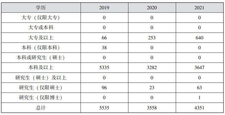 2019—2021年遼寧省考各學(xué)歷招錄職位數(shù)量