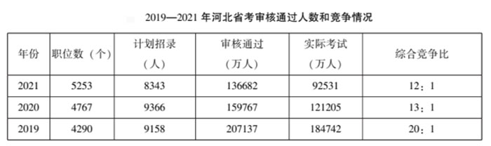 ?。?019-2021年河北省考審核通過人數(shù)和競爭情況)