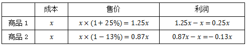 例2:某商店的兩件商品成本價相同,一件按成本價多25%出售,一件按成本價少13%出售,則兩件商品各出售一件時盈利為多少( )?