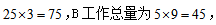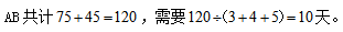 例3:某市有甲乙丙三個工程隊,工作效率比為3:4:5。甲隊單獨完成A工程需要25天,丙隊單獨完成B工程需要9天。若三個工程隊合作,完成這兩項工程共需要多少天( )。