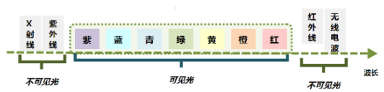 光是一種電磁波,由光子組成。通常用波長和頻率來衡量光的性質(zhì),波長指的是波在一個(gè)振動(dòng)周期內(nèi)傳播的距離,頻率指的是波在一個(gè)振動(dòng)周期內(nèi)傳播的數(shù)目。在光速不變的情況下,波長和頻率呈反比。根據(jù)人眼對(duì)光的感知情況,又將光劃分為可見光和不可見光。如圖所示: