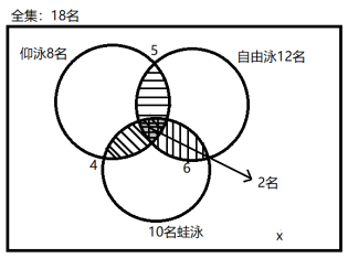 【例題3】18名游泳運(yùn)動(dòng)員中,有8名參加仰泳,有10名參加蛙泳,有12名參加自由泳,有4名既參加仰泳又參加蛙泳,有6名既參加蛙泳又參加自由泳,又5名既參加仰泳又參加自由泳,有2名這三個(gè)項(xiàng)目都參加。三個(gè)項(xiàng)目都沒有參加的有多少名?( )
