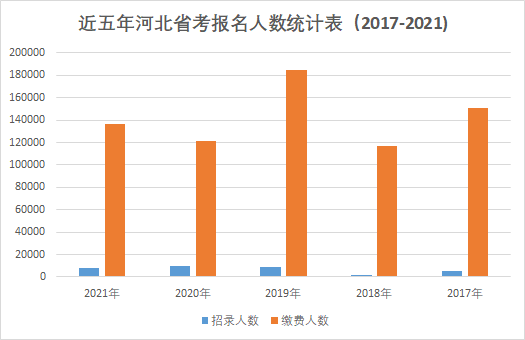 2017年-2021年河北省考共招錄17315個崗位33820人,報名共繳費710272人,最高競爭比267:1,267個人爭奪同一個崗位。