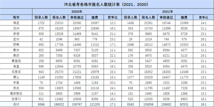 2021年省考共招錄8343人,報名人數(shù)159356,審核通過人數(shù)共,136682人,繳費人數(shù)92531人。2020年省考共招錄9366人,報名人數(shù)186022,審核通過人數(shù)共159767人,繳費人數(shù)121205。