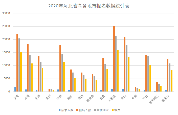 石家莊為歷年審核通過、繳費人數(shù)最多的地市;保定、唐山、邯鄲報名審核通過人數(shù)和繳費人數(shù)也較多。